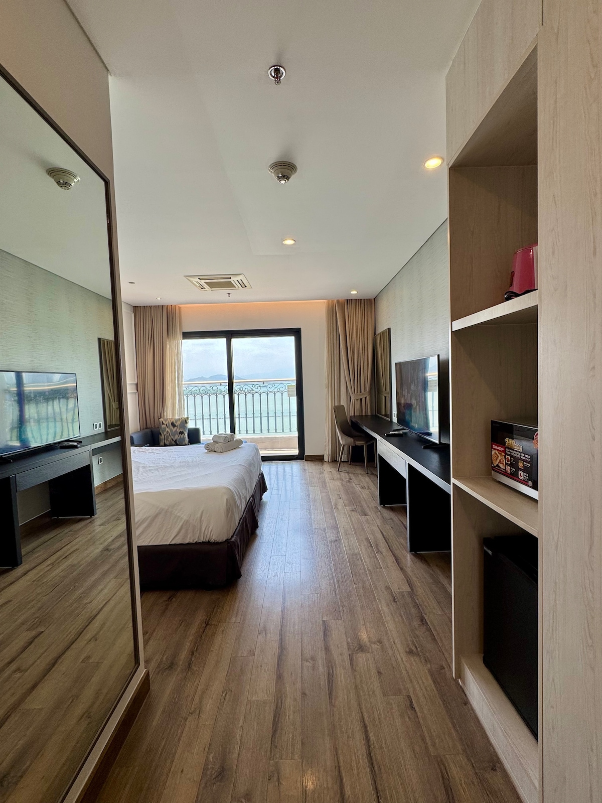 STAN ima POGLED NA ZALIV I PANORAMSKI POGLED NA GRAD RIJEKU HAN, koji se nalazi na 27. spratu (najvišem dijelu zgrade) hotela Wyndham Da Nang Golden Bay; osigurava sigurnost, čistoću, hladnoću. - Mjesto gdje možete imati panoramski pogled na grad sa dvije strane rijeke Han - Da li je pravo mjesto za uživanje u najljepšem zalasku sunca u gradu - Najidealnije je mjesto za uživanje u eksplozivnom vatrometu Ova zgrada je udaljena samo 8 km od aerodroma i 3 km od mora, tako da možete pješke ili biciklom do plaže