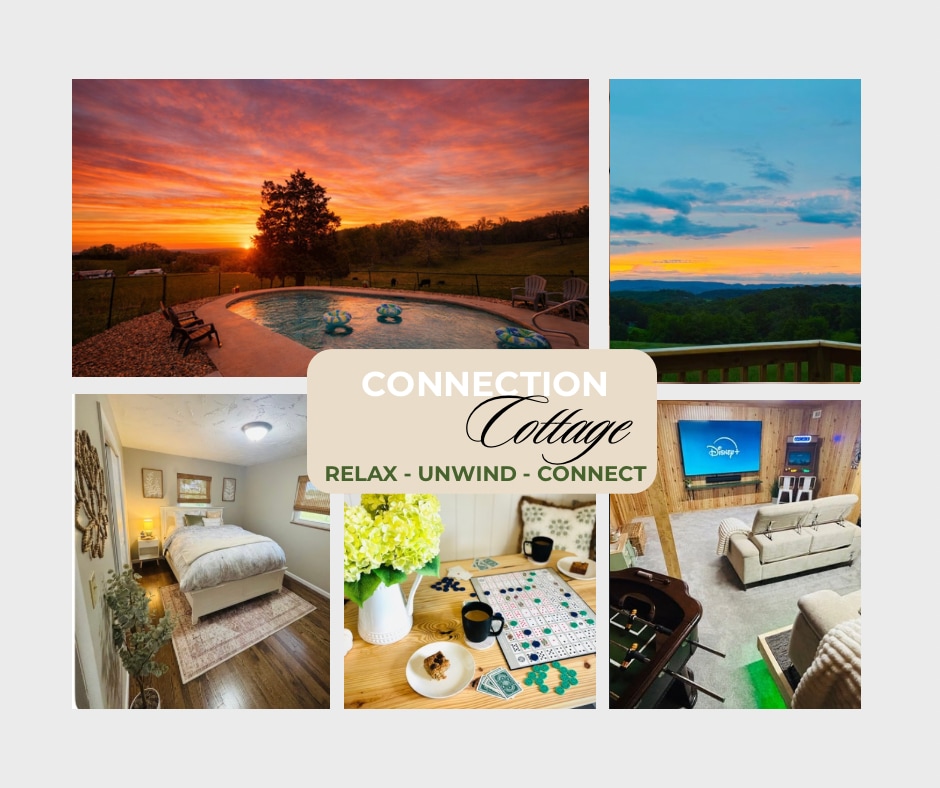 Opustite se, opustite i povežite se u „Seoskoj kućici za povezivanje 2”! Smješten među farmama Talbot, TN, gdje obiluju predivni zalasci sunca i pogled na planinu. Uživajte u svim sadržajima koje nudimo u našem smještaju za nepušače od 2100 kvadratnih metara, kao što su pjenušavi bazen, plišana posteljina, Roku filmski TV od 85inča, kamini, gurmanski kafić, prilagođeni aparat za video igre, stoni fudbal i terasa sa ognjištem. Naš cilj je da se osjećate povezanije i osvježenije nego kada ste ušli! Vaši domaćini, Džošua i Kimberli
