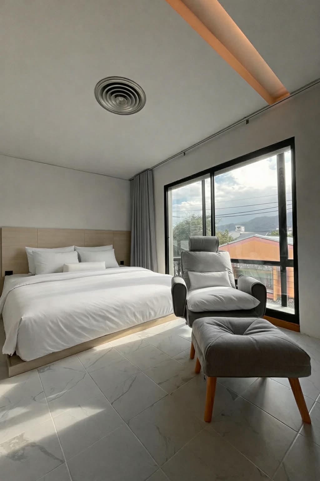 „MAJA ZELENO” Cijela trospratna kuća u nizu sa 2 spavaće sobe + 2,5 kupatila (1 đakuzi) MAYA GREEN dijeli bazen sa slanom vodom, garnituru za sjedenje na otvorenom u našoj tropskoj bašti, parking mjesto i vešernicu sa svojom kućom blizancima (MAJA CRVENA). Prostrana vila sa bazenom inspirisana brutalističkim dizajnom, koja elegantno kombinuje moderne i rustične elemente. Vaša oaza u blizini grada, ali samo oko 500 metara udaljena od tržnog centra MAJA i područja Nimman. Dostupan je Smart TV. Wi-Fi/Brzi internet: 500/500 Mbps