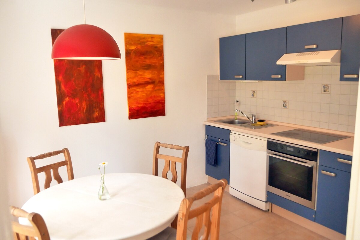 Haus Regina ist ein selbständiges kleines Reihenhaus auf zwei Etagen mit eigenem Eingang. Unten sind das Bad, die Wohnküche und das Wohnzimmer mit Zugang zur überdachten Terrasse. Oben sind die zwei Schlafzimmer: Das Große mit einem Doppelbett, das Kleine mit zwei Einzelbetten. Wie in Ferienhäusern üblich, sind Bettbezüge und Handtücher nicht im Preis inbegriffen, können aber für € 7,50 pro Person und Woche gestellt werden. EineTesla-Ladestation gibt es in 5 Km Entfernung an der Autobahn.