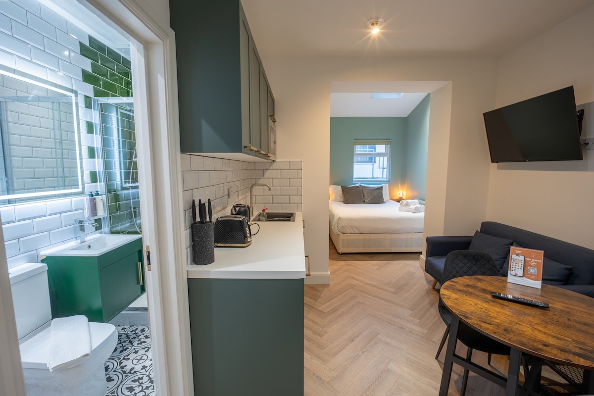 Modern serviced studios in King’s Cross, ideal for business or leisure. Each stylish unit offers high-speed Wi-Fi, smart TV, and kitchenette for comfort and convenience. Just minutes from King’s Cross & St. Pancras, enjoy fast links across London, nationwide rail, and the Eurostar. Explore nearby Coal Drops Yard, Granary Square, Camden Market, Regent’s Canal, the British Library, and West End theatres. A perfect base for short stays, business trips, or city breaks in a vibrant neighbourhood.