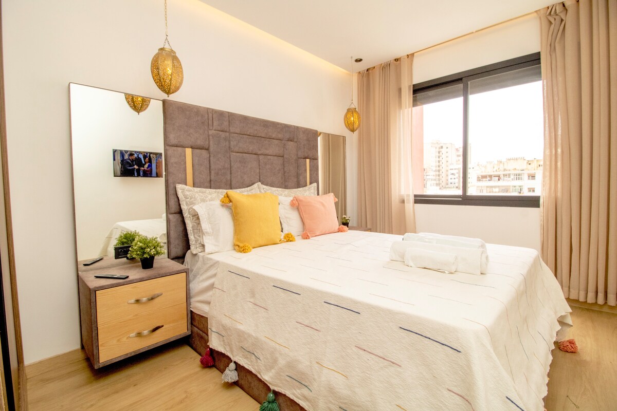 "Welcome to one of the best locations in Casablanca! Explore our modern apartment featuring self-check-in, 24-hour concierge service, AC, and brand-new amenities. Enjoy convenient parking and easy access to Casablanca's Corniche, just 2 minutes away, the port in 6 minutes, private beaches in 8 minutes, and the vibrant restaurant and nightlife scene also in 8 minutes. The historic Medina is just a 10-minute drive from your doorstep."