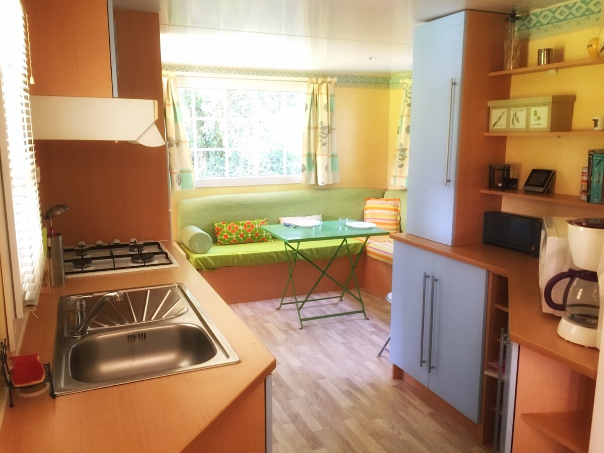 mobil home situé dans une propriété de 2000m2 arborée, et sécurisée .IL comprend 1 chambre double et 1 chambre avec 2 lits simples, un salon avec téléviseur,1 cuisine avec micro- onde,cafetière,bouilloire,grille pain,lave linge. 1salle de douche et wc séparé. Il est climatisé. De la jolie terrasse fleurie ou se trouve un salon ,on a accès à un jardinet avec table ,chaises et barbecue.Nous fournissons draps et serviettes de toilette. Un cadre calme et fleuri à 2km d'une plage de sable fin .