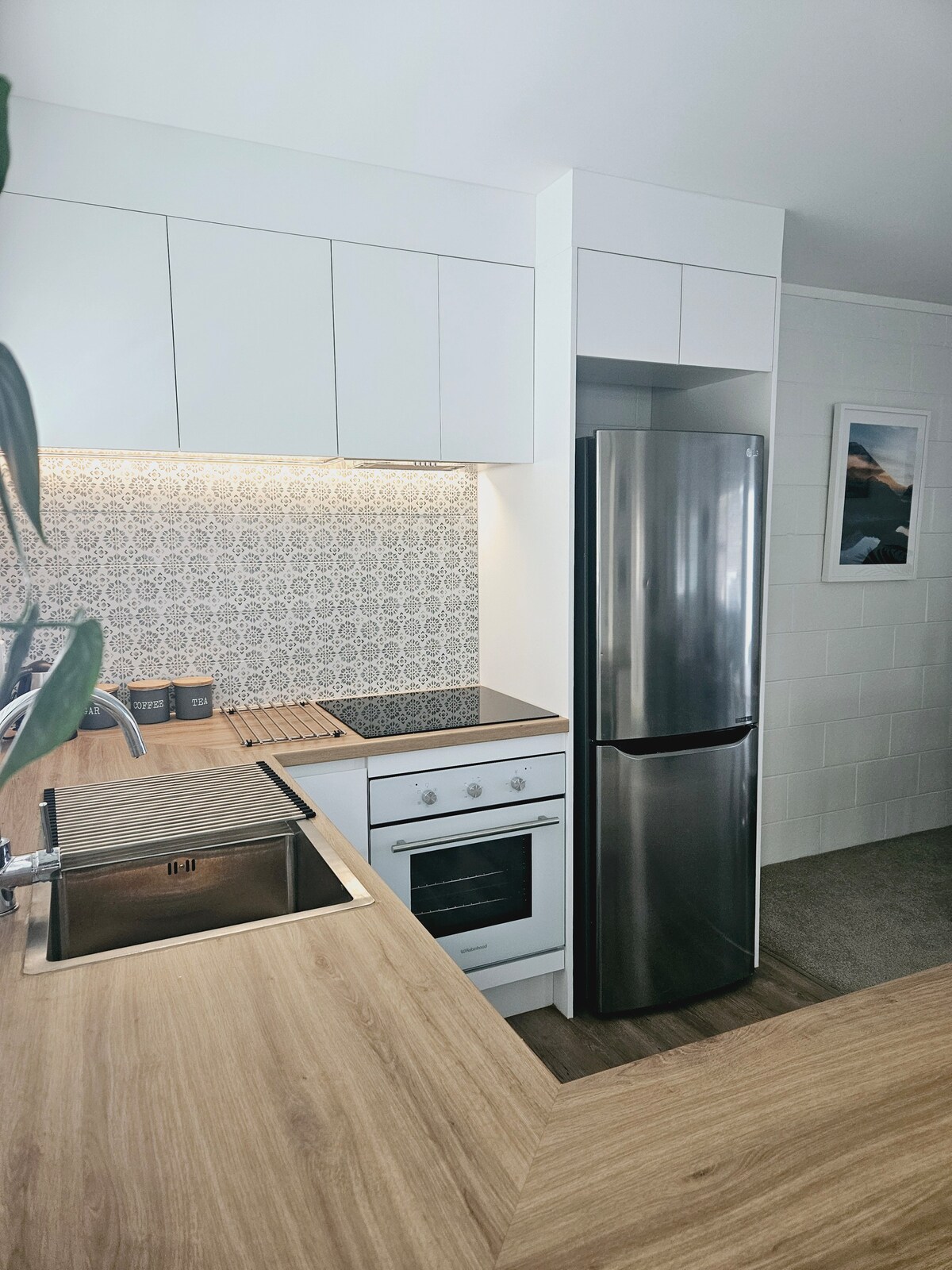We welcome a small family or those seeking a short beach stay. Beautiful Taylor’s Bay beach is just down the drive and across the road from the studio apartment. Enjoy the ambiance of this recently renovated studio apartment set up on the ground floor of our Bach. Perfect for the short beach stay experience. The sunny space has double glazed windows and black out blinds in the bedroom containing a comfy Queen bed and a set of bunks ideal for kids. Linen is now supplied excluding beach towels