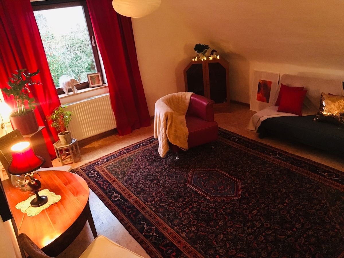 The cottage ‘Lichtberg 2’ is the smaller of the two neighbouring organic houses (see also ‘Lichtberg 1’). It is enchantingly secluded in the garden and by the field - and yet very close to the city (10 minutes to the university, city centre, main station and motorway) and has been renovated with high-quality materials in line with building biology. A beautiful home for 2 or 3 guests who like to hike, meditate or simply enjoy the healthy offside. Car park with electric wall - payment to the host