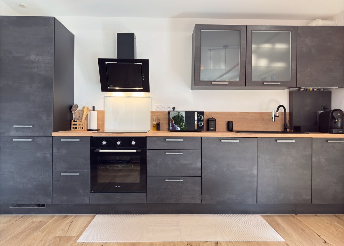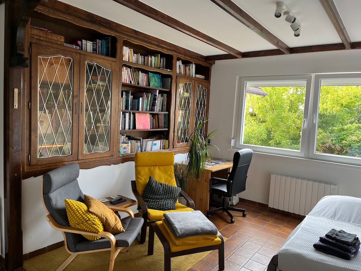 Venez découvrir ce chaleureux studio situé entre Belfort et Montbéliard et proche de la Suisse. A 5 km environ: Hôpital , Gare TGV, Accès facile via A36. L'appartement est neuf, décoré avec goût afin de vous garantir le meilleur confort lors de votre séjour à Vézelois. Il est idéal pour un couple, éventuellement avec un enfant, ou voyage d'affaires. Ce studio de 40 m2 est au 2ème étages de notre maison individuelle avec entrée indépendante et petite terrasse en bas de l'escalier d'accès