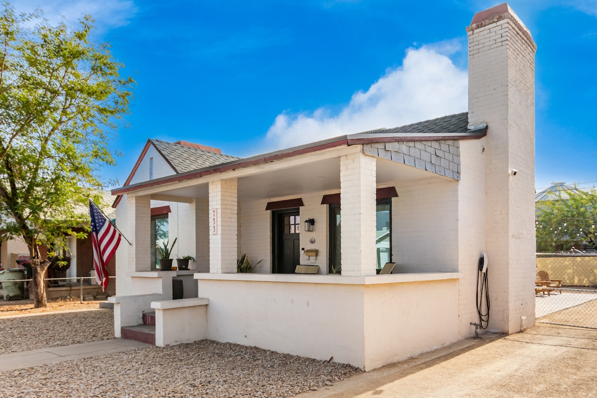 ★ Pristupite vrhunskom doživljaju centra grada dok ste smješteni u mirnoj istorijskoj četvrti. Umjetnička četvrt★ Ruzvelt Rou, muzeji, sport, barovi/restorani i muzička mjesta (Footprint Center, Chase Field, The Van Buren, Orpheum Theater) UDALJENA 1 MILJU ★ Privatni ulaz s ogradom + parking + unutrašnje dvorište + gostinjska kuća od 500 kvadratnih metara sa dnevnom sobom i udobnim bračnim krevetom. ★ Potpuno opremljena kuhinja + trpezarijski sto + mašina za pranje i sušenje veša u punoj veličini + udobna terasa