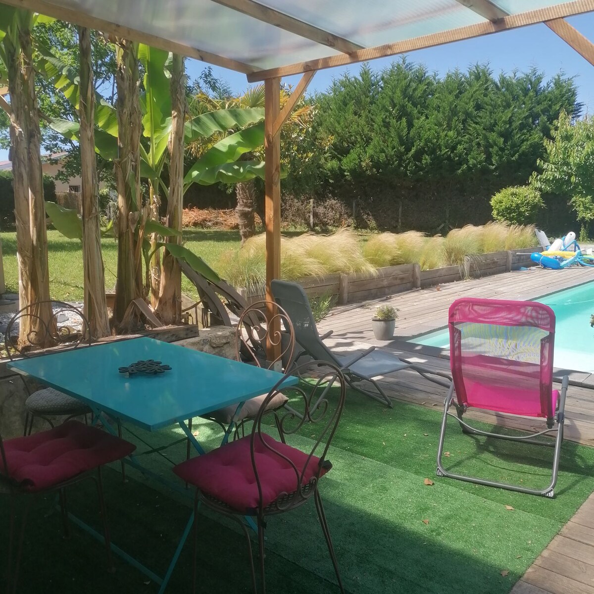 Renovirana staja, svetla, kombinuje modernost i stari šarm, zajednički bazen u privatnom objektu. Zaseban ulaz, natkrivena terasa, pogled na šumovitu baštu i bazen. Funkcionalna kuhinja, kupatilo sa italijanskim tušem, spavaća soba sa pogledom na bazen. Veliki otvori za uživanje na otvorenom. Prodavnice su udaljene 5 minuta. Besplatan parking. Mirno i tiho područje. 5 minuta od Daksa, 35 minuta od plaža, 45 minuta od Baskije, 1 sat od Španije, 20 minuta od autoputa.