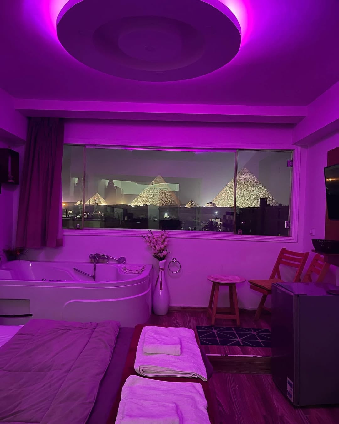 Dobro došli u jedinstveno utočište na samo 5 minuta od piramida! Ovaj studio nudi panoramski pogled na piramidu i privatnu hidromasažnu kadu. Prostor se odlikuje faraonskim dizajnom, sa jedinstvenim dekorom i arhitektonskim detaljima koji stvaraju istorijski, prijatan ambijent. Uživajte u bračnom krevetu, trpezariji, čajnoj kuhinji i privatnom kupatilu. Gosti takođe imaju pristup zajedničkoj krovnoj terasi sa zadivljujućim pogledom za nezaboravan boravak.