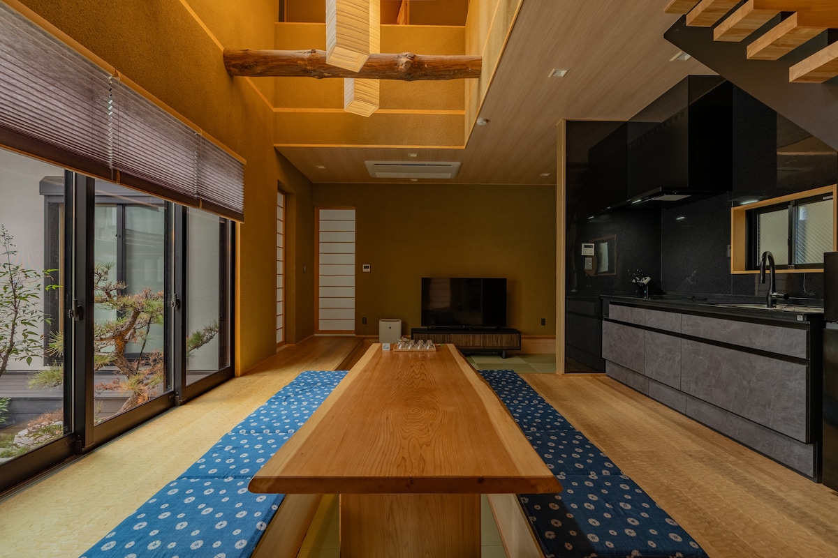 Tsuru INN Matsukaze A luxurious Japanese-modern house, 5-min walk from Tsuruhashi Station (Sennichimae Line, JR Loop, Kintetsu Nara Line). Direct trains reach Namba, Osaka Castle, and Nara. Nearby: Tsuruhashi Fish Market, Enha-no-Yu hot spring, Tsuruhashi shopping street, and Korea Town. The open living space overlooks the garden, providing a relaxing area for dining and leisure. Features a spacious washbasin, large bathtub with garden views, and premium linens for comfort.