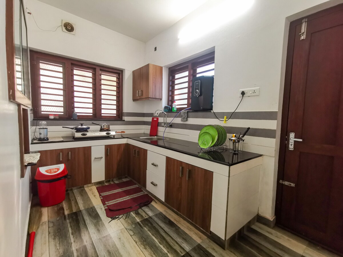 Independent entire Villa, Centrally located, quiet, and peaceful, this retreat is perfect for exploring the city’s vibrant dining, shopping, beaches, and entertainment. A 10-15 min drive to the railway station, South Beach, Lulu Mall, MIMS Hospital, and popular spots like Paragon Restaurant, Focus Mall, Tagore Hall, Maanachira square, and Crown Theater. Clean, tidy, and fresh, with support staff on hand. Base price covers 4 guests; additional guests incur a nominal charge.