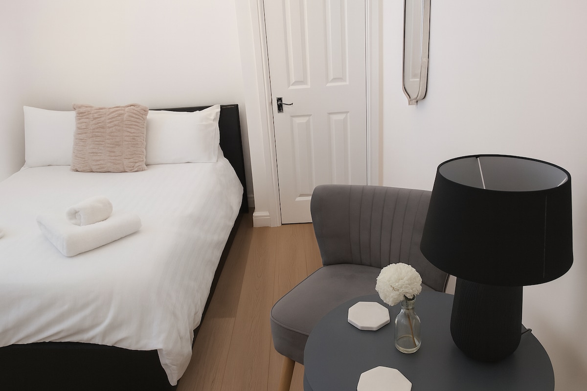 Svež, svetao i prostran stan na Klarensovoj paradi. Jedan sprat stana od trospratnog penthausa, odlična lokacija u samom srcu centra Sautsea, na pragu zajedničke i morske obale. Pogled preko krovova pozadi. Velikodušna spavaća soba sa bračnim krevetom, garderoba. Moderno kupatilo, snažan tuš sa pumpama. Potpuno opremljen kuhinjski restoran sa sofom. Imajte na umu da se ovaj stan nalazi na 3. spratu, nema lifta. Mogu se organizovati dozvole za parkiranje.