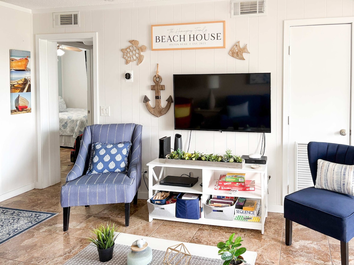 Warm, modern, and designed with character—this newly remodeled 2-bed/2-bath is the closest condo to Hilton Head's hidden gem beach, with lagoon and sound views. King bed in the primary, twin beds in the kids' room: screened-in sunroom, 3 pools, hot tub, tennis. Fully stocked kitchen with a guest-favorite coffee bar, restocked fresh each stay. In-unit laundry, big-screen TVs in every room, all the beach gear you need (cart, chairs, boards, toys, and more), 400 MB Internet—no cleaning fee!