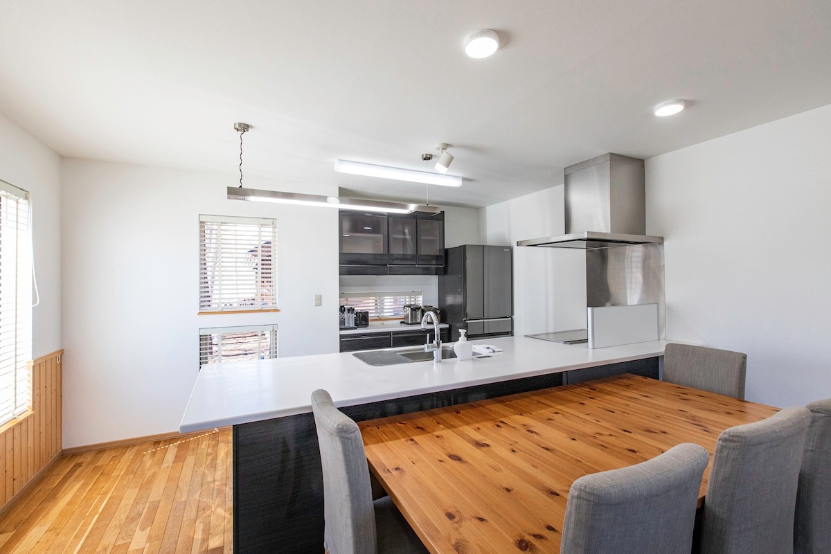 This spacious, pet-friendly villa, renovated in 2024, can exclusively host up to 9 guests. The 10000 sq. feet property includes a well-maintained Japanese garden for BBQs, four bedrooms, three toilets, two bathrooms, and an office work space. Although located in a serene old town, it’s within walking distance of tourist spots like Nusamai Bridge for the spectacular sunset view and Suehiro-cho for varieties of seafood restaurants. Perfect for a family getaway, we warmly invite you to stay!