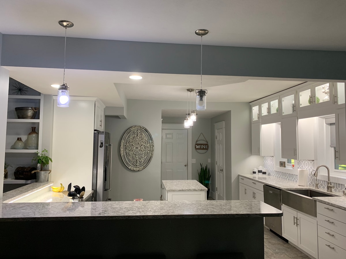 Mirna, zabavna, otvorena, namjerno dizajnirana oaza s 3 spavaće sobe u centru Kernija u Nebraski. 🏡 Apartman sa velikim bračnim krevetom, spavaća soba sa bračnim krevetom, „spavaonica“ sa dva kreveta, futon, 2 kauča, krevet na sprat sa dva odvojena kreveta i vazdušni dušek za bračni krevet Roku televizori i dodatna ćebad u svakoj sobi PS4 Stoni fudbal 🤙 Boho viseće stolice u obliku jajeta Sjedala za trpezarijski sto 8 Kafić ☕️ Mesarski blok Kompletan frižider i zamrzivač Mašina za pranje i sušenje veša Gomila igara Privatno ograđeno dvorište sa velikom terasom, trpezarijskim stolom, stolom za vatru, roštiljem i ležaljkama! Igrajte se i opustite 🪴🏡🪴