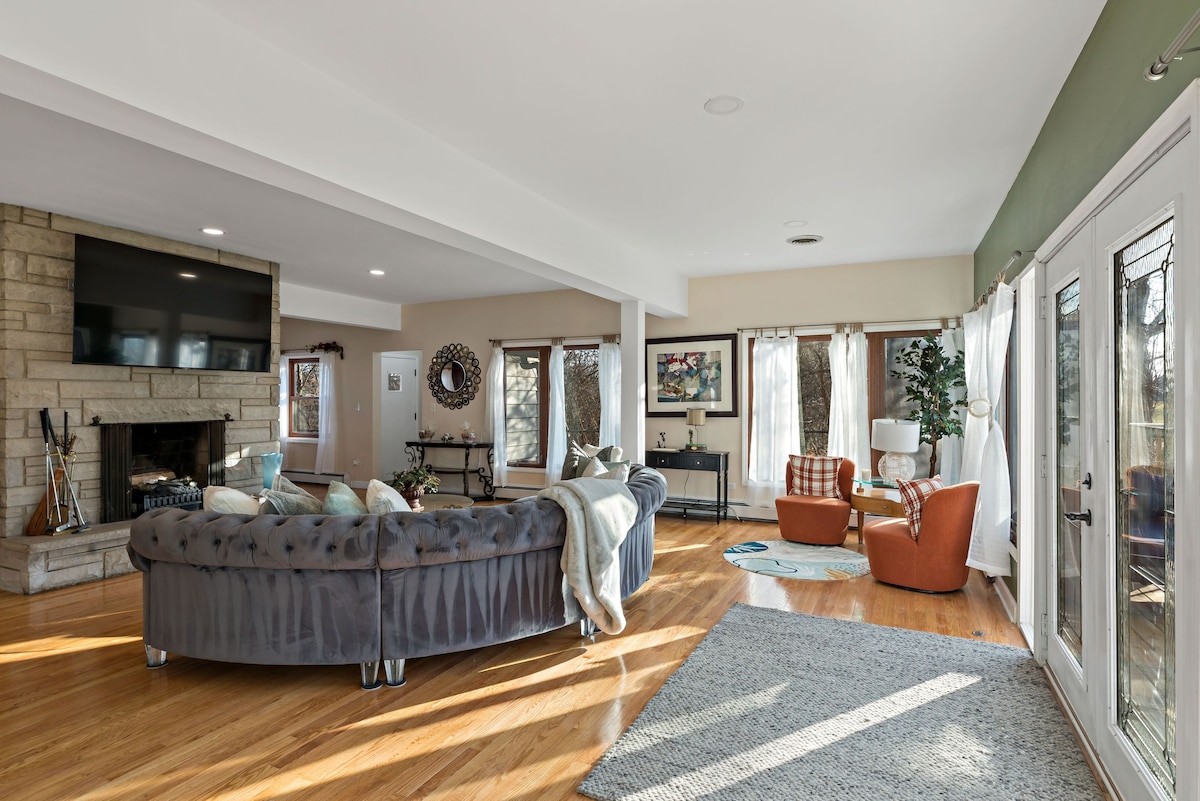 Kuća na ranču sa 3 spavaće sobe i 2 kupatila u mirnom ćorsokaku. Velika ograda u dvorištu za decu, pse i odrasle da se igraju tokom dana, a zatim se noću opustite pored vatre. Udaljenost (50 stopa) do bara/restorana sa privatnim ulazom. 15 milja (25 minuta) od centra Čikaga. A za vas parove, vratite se kući iz napornog dana, opustite se i opustite se u hidromasažnoj kadi sa 8 jet jacuzzija koja će se udobno smestiti.