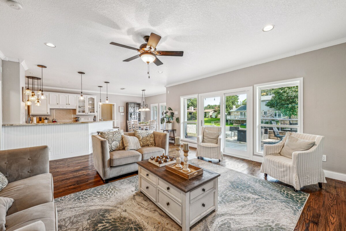 Beautifully updated lake front home! The Vista Grande lake house is the perfect retreat to spend time with friends and family, swimming, fishing, exploring on the paddle boat, grilling, and relaxing! Watch the sunset with a glass of wine from the seawall, hammock, or either of the 2 patio areas. Located at the end of a quite cul-de-sac in a gated community about 15 minutes from the Granbury Square.