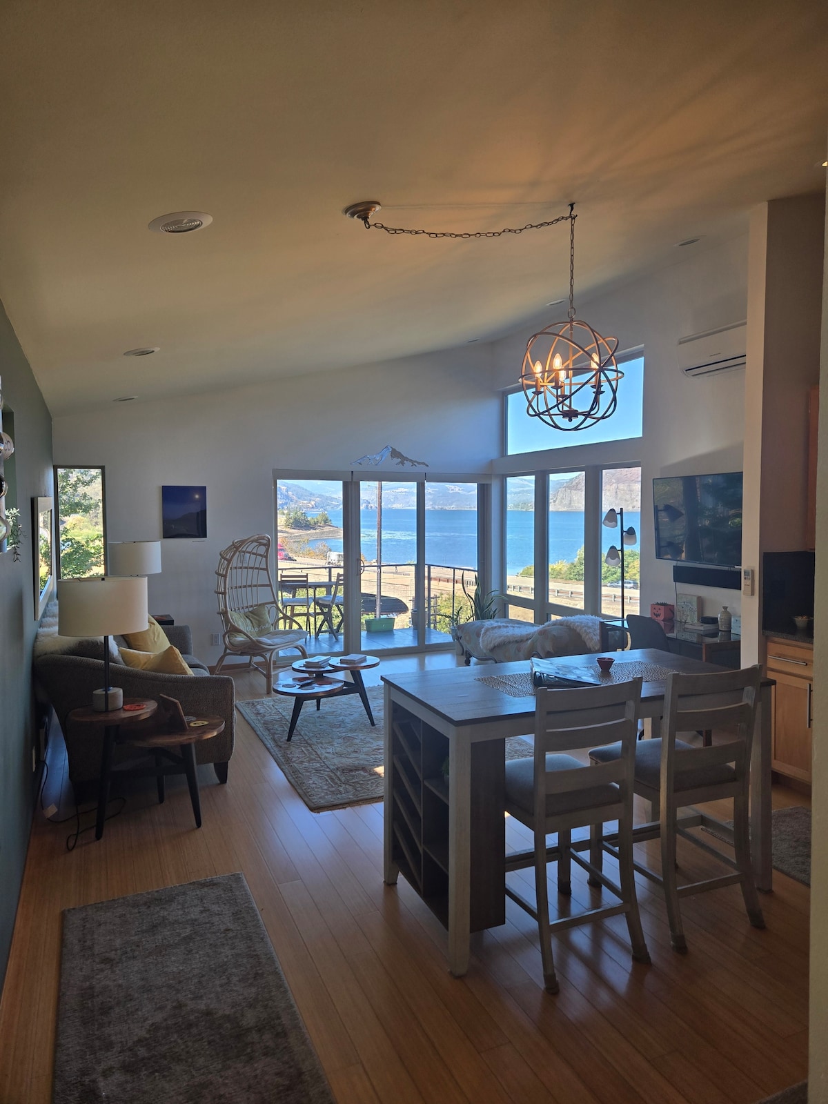 Deluxe apartman s pogledom na rijeku White Salmon i Columbia, manje od milje od rijeke Hud. Okruženi ljepotom klisure i planinarskim stazama. Uključuje: hidromasažnu kadu; kamin; privatni parking i ulaz; snabdevenu gurmansku kuhinju, kupatilo sa tuš kabinom, bračni krevet, kauč na razvlačenje i dušek na podu. Apartman ima Wi-Fi, TV sa ravnim ekranom, AppleTV, BluRayDVD i Apple HomePod. Gosti takođe imaju pristup baštama sa terasom u domu, ribnjaku koi, kaminu, trpezariji na otvorenom, hidromasažnoj kadi i teretani u domu.