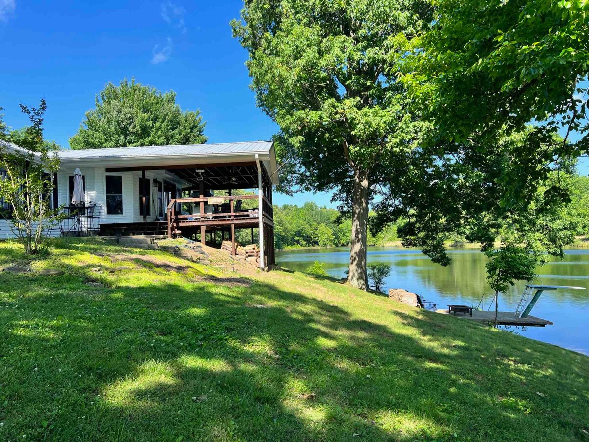 Relax with the whole family at this peaceful 2 bedroom, 2 bath house with beautiful lake views. Mama Jean's Cottage is on a dead-end road in a quiet neighborhood. Ample parking, wheelchair ramp and covered parking are available. The house has lovely views of a 20-acre, semi-private lake. There are outdoor seating areas, a dock and a fire pit. The dock is shared with another Airbnb property. It's an easy drive to restaurants, parks, and all that scenic western Kentucky has to offer.