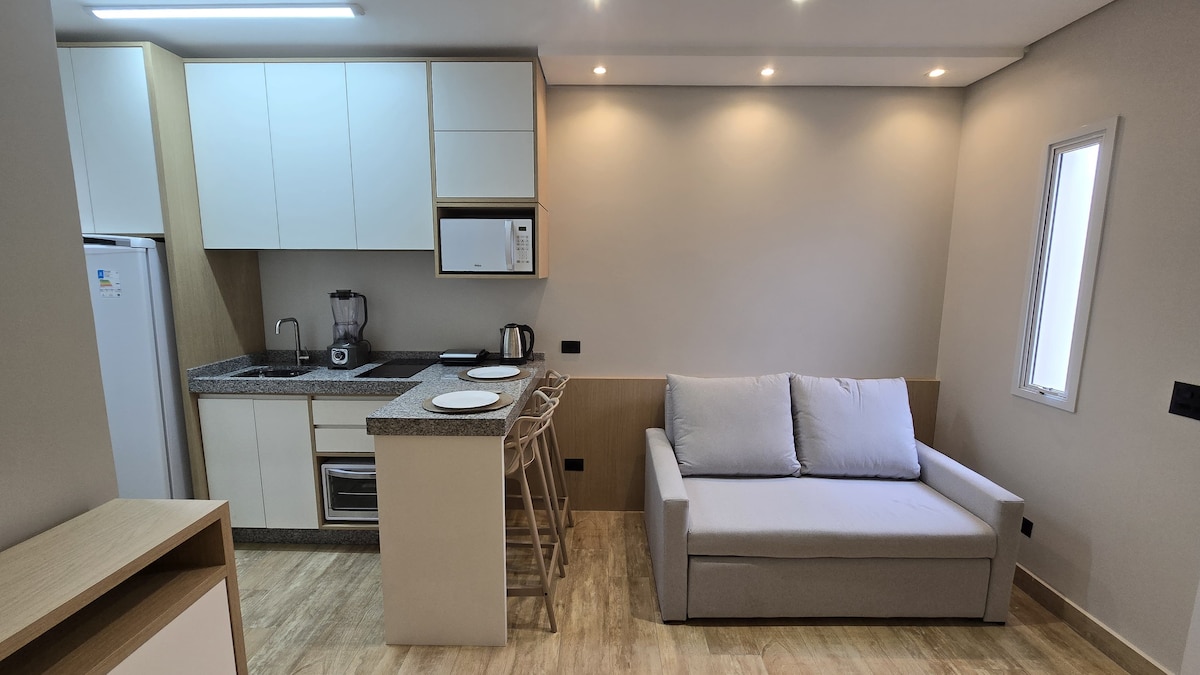 Penthaus apartman, 900 metara od plaže Kaioba i jedan blok od Avenide JK, u zgradi sa samo dve stambene jedinice. Idealno za parove i porodice koji traže udobnost i praktičnost: spavaća soba sa sopstvenim kupatilom, bračnim krevetom i dodatnim dušekom, dnevni boravak sa sofom na razvlačenje, pametnom televizijom i Wi-Fi mrežom, potpuno opremljena kuhinja sa prostorom za roštilj i klima-uređajem, kao i terasa sa ležaljkama za uživanje u zalasku sunca. Može da primi do 6 gostiju, a veća udobnost se postiže sa 4 osobe. Posteljina je uključena, parking mesto je natkriveno, a smeštaj je pogodan za kućne ljubimce.