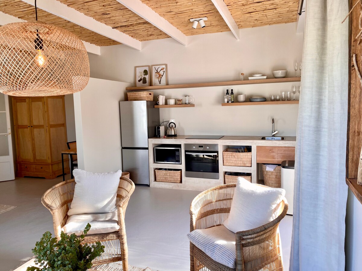 Bivši umjetnički atelje pretvoren je u predivan mali dom koji je povezan sa glavnom kućom sa panoramskim pogledom na dolinu iz vašeg kreveta i vrta. Dalje u planini Kronenžičt, u mirnom delu grada, možete da se opustite dok se kupate u privatnoj i grejanoj hidromasažnoj kadi, opustite se ispod kišnog tuša sa zadivljujućim pogledom na zadnju stranu stonih planina i malim lavovima ili da započnete šetnju uz zalazak sunca na prelepim peščanim dinama pored našeg imanja, čak i sve do Sendi Beja.