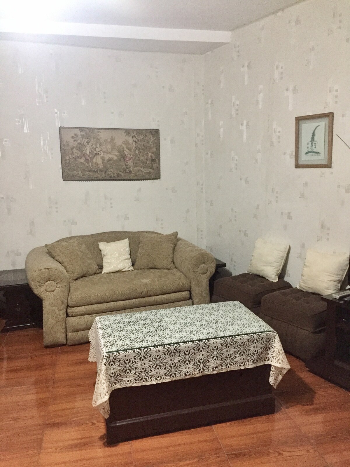 Mini Dpto. totalmente equipado, independiente, ubicado en el primer piso con 2 puertas, Una a la cochera y otra a la calle. El alojamiento es privado, confortable y práctico, con cocina, cama matrimonial para 2 personas, y un camarote con 2 camas, una sala con sofá cama, ubicado a 10 minutos de la ciudad de Trujillo, te conectamos con agencia de turismo de confianza que te pueden recoger de la casa, El lugar no es residencial pero muy cómodo.