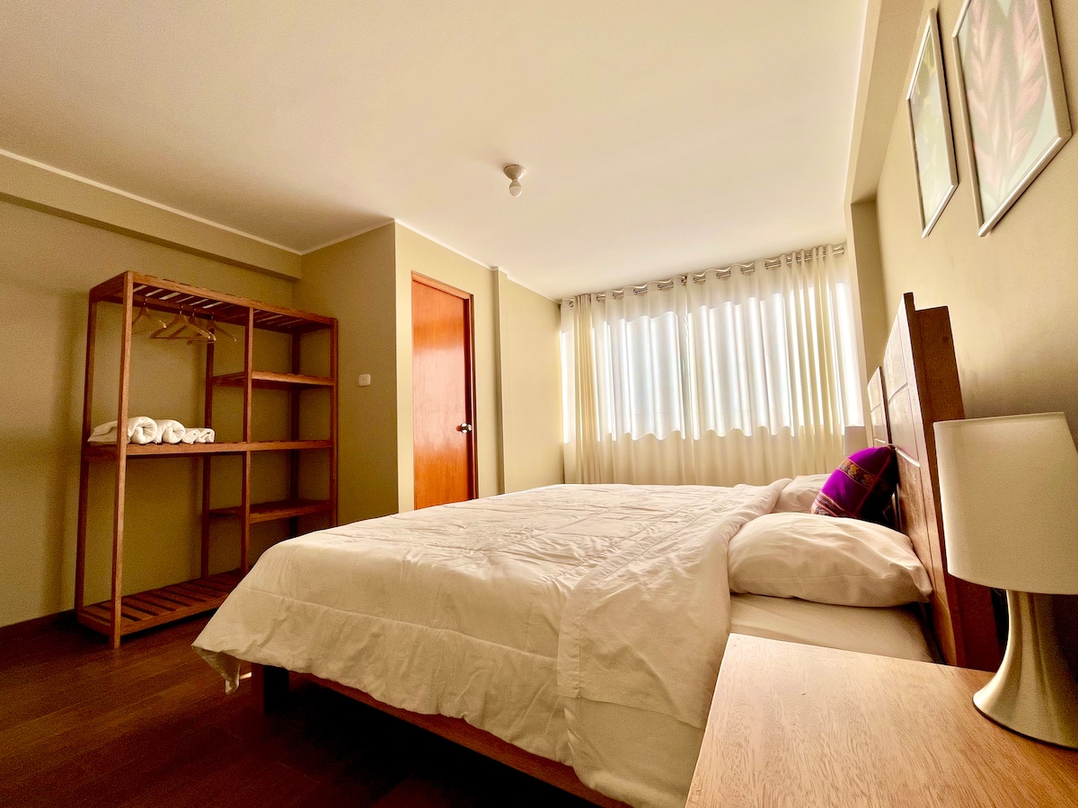 Stan je moderan i elegantan, sa pogledom na planine, nalazi se na 3. spratu odvojene zgrade, u okviru bezbednog i mirnog porodičnog kondominija, kapa maks. 4 osobe, sa 2 spavaće sobe, bračnim krevetom i TV-om, 2 kupatila, kuhinjom opremljenom dnevnim boravkom, Wi-Fi, hemijskim čišćenjem i besplatnom natkrivenom garažom. Oko 8 minuta vožnje od Plaza de Armas, restorana i autobuskih stanica. Idealno za vaš lični, grupni ili porodični boravak u Huarazu; siguran sam da ćete se osećati kao kod kuće.