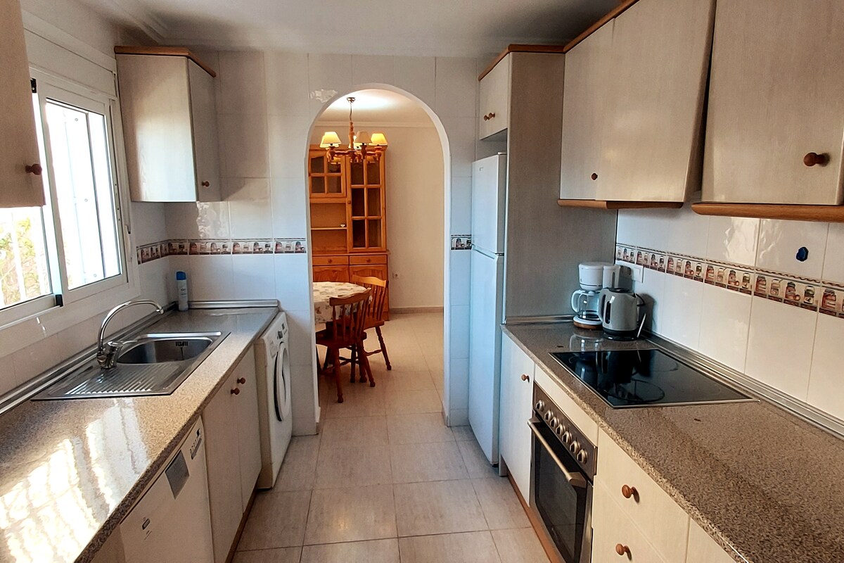 Dobro održavana privatna KUĆA od 80 m² nalazi se na mirnom imanju u uglu. Možete uživati na suncu cijeli dan, na prekrasnom imanju u prizemlju ili na veličanstvenoj gornjoj terasi za sunčanje sa domaćim zimskim vrtom. Postoji roštilj za prijatne večeri na roštilju. WI-FI U neposrednoj blizini se nalaze 2 divna ZAJEDNIČKA BAZENA. Predivne plaže su na nekoliko minuta vožnje Do raznih dobrih restorana možete doći za oko 10 minuta hoda. Supermarketi u kratkoj vožnji.