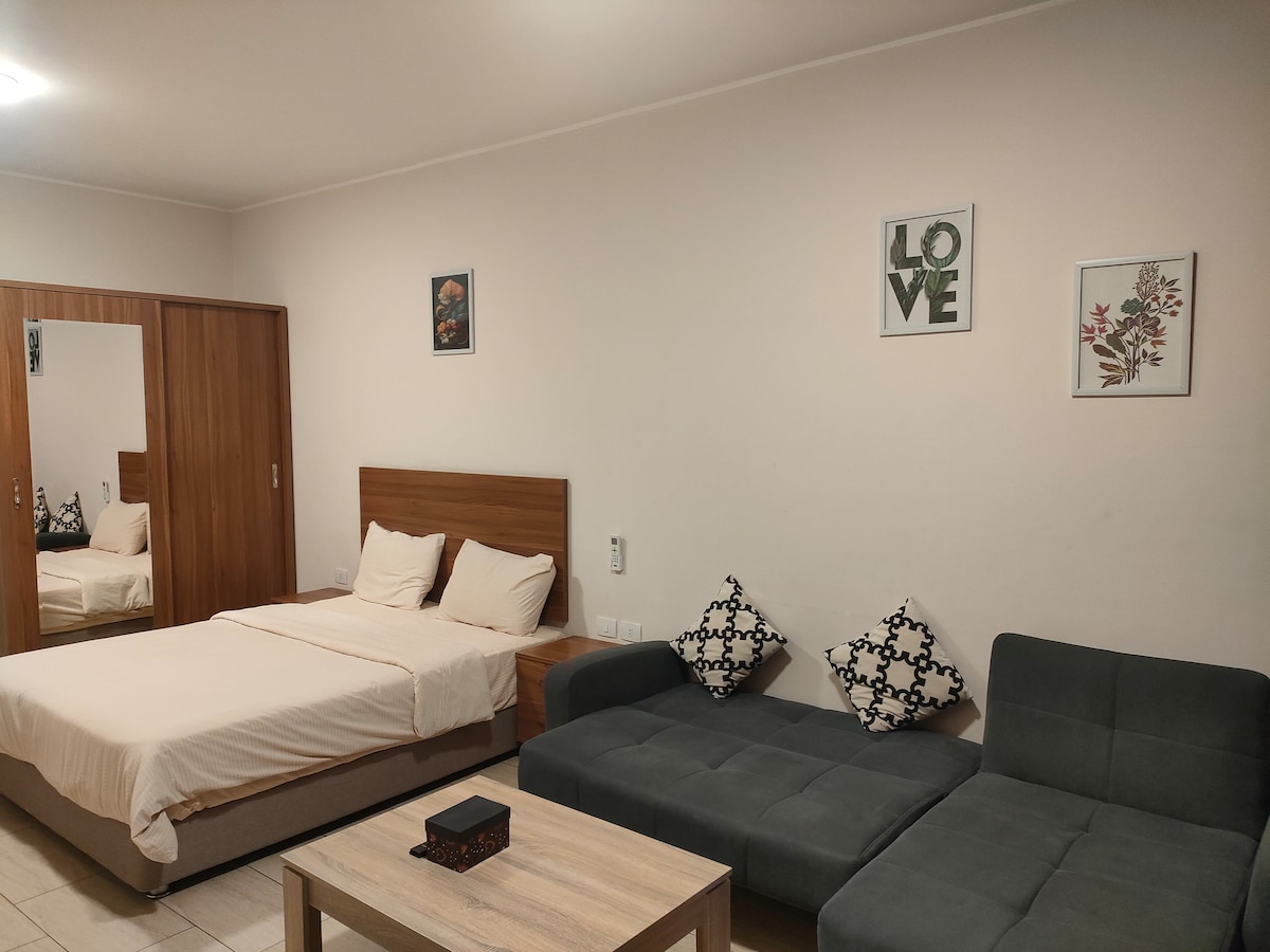 Brand new studio with cozy interior modern furniture , huge balcony and private sandy beach, available 3 pools, sport court . The resort is 10 minutes from Hurghada city center and 10 minutes from Hurghada marina, the airport is 15 minutes far away. Golden beaches and guaranteed sunshine are what made Hurghada famous to spend your holiday. The colourful reefs, amazing corals and tropical fish are among the finest in the world. Your perfect holiday by the sea and sunny weather all year