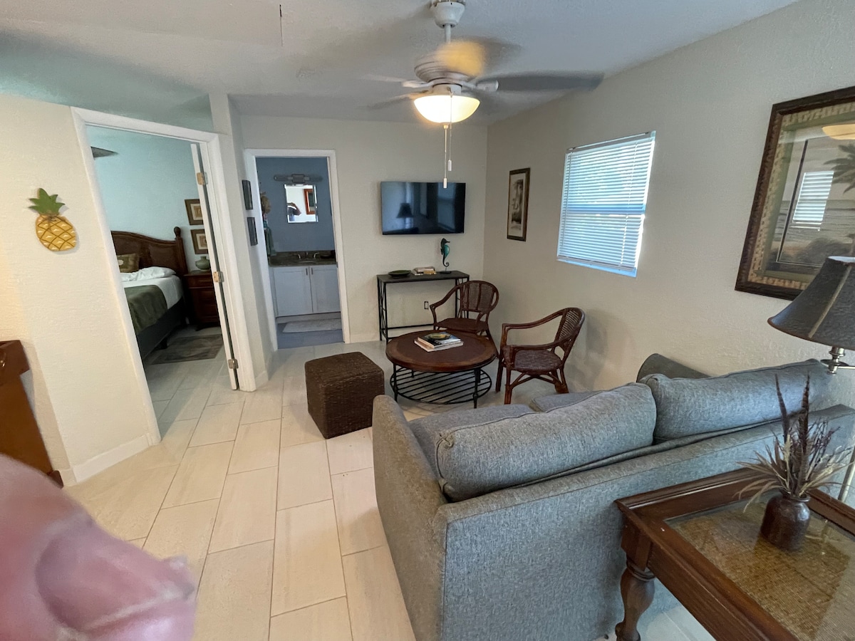 Dobro došli u našu udobnu efikasnost na ostrvu Saut Hačinson na Floridi! Naša jedna spavaća soba je savršena za samce ili parove, sa bračnim krevetom Marfi i privatnim ulazom u prizemlje. indukcionu ploču za kuvanje, rernu za konvekciju, frižider u punoj veličini, Smart TV i kupatilo. Nalazimo se u prijateljskom okruženju, blizu smo plaža, pristaništa, restorana i istorijskog centra grada. Dođite i uživajte u svemu što nudi Obala s blagom!