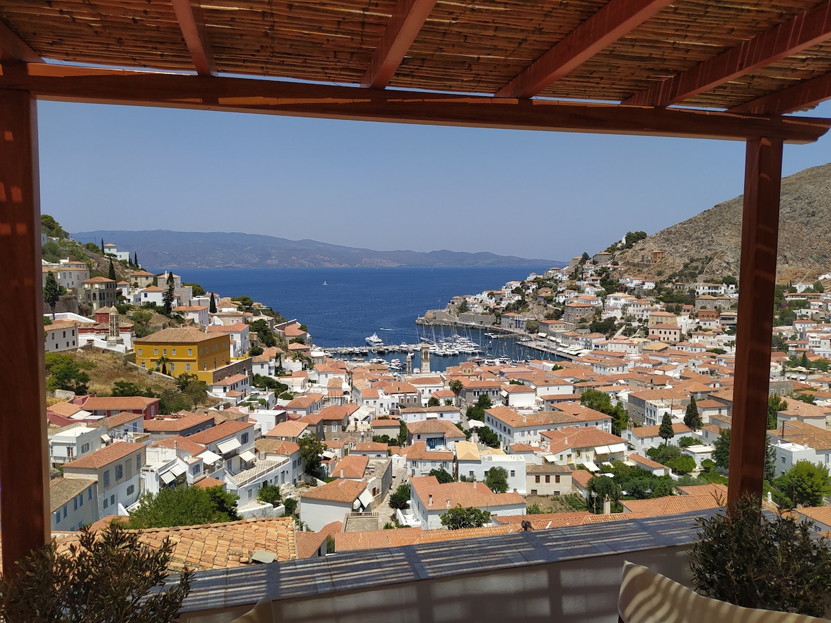 Hidrajev pogled je smeštaj u centru ostrva koji pruža panoramski pogled na Hidru i njenu luku u kojoj možete uživati sa krovne terase kuće, kao i iz spavaćih soba. Kuća ima potpuno opremljenu kuhinju za pripremu svakodnevnog doručka, ručka ili večere. Dnevni boravak i spavaće sobe imaju sopstveni TV, klima-uređaj i Wi-Fi. Takođe, kuća je udaljena samo 10–12 minuta od luke do centra ostrva peške, prateći put sa stepenicama.