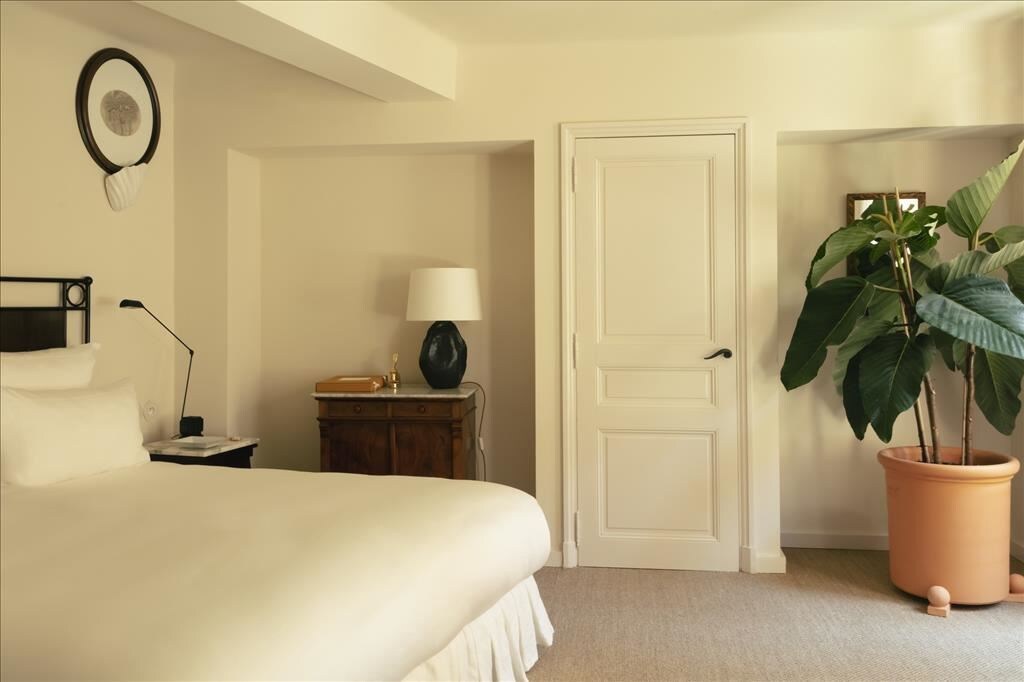 Refined, with white and beige colors, it invites calm and tranquility. It is a large room with high ceilings that overlooks the patio. A wardrobe to store your belongings and take possession of the place, a desk to write, draw, or dream: this is the room of the regulars. Louis de Funès used to come here to take a break during the shooting of The Troops of Saint-Tropez.