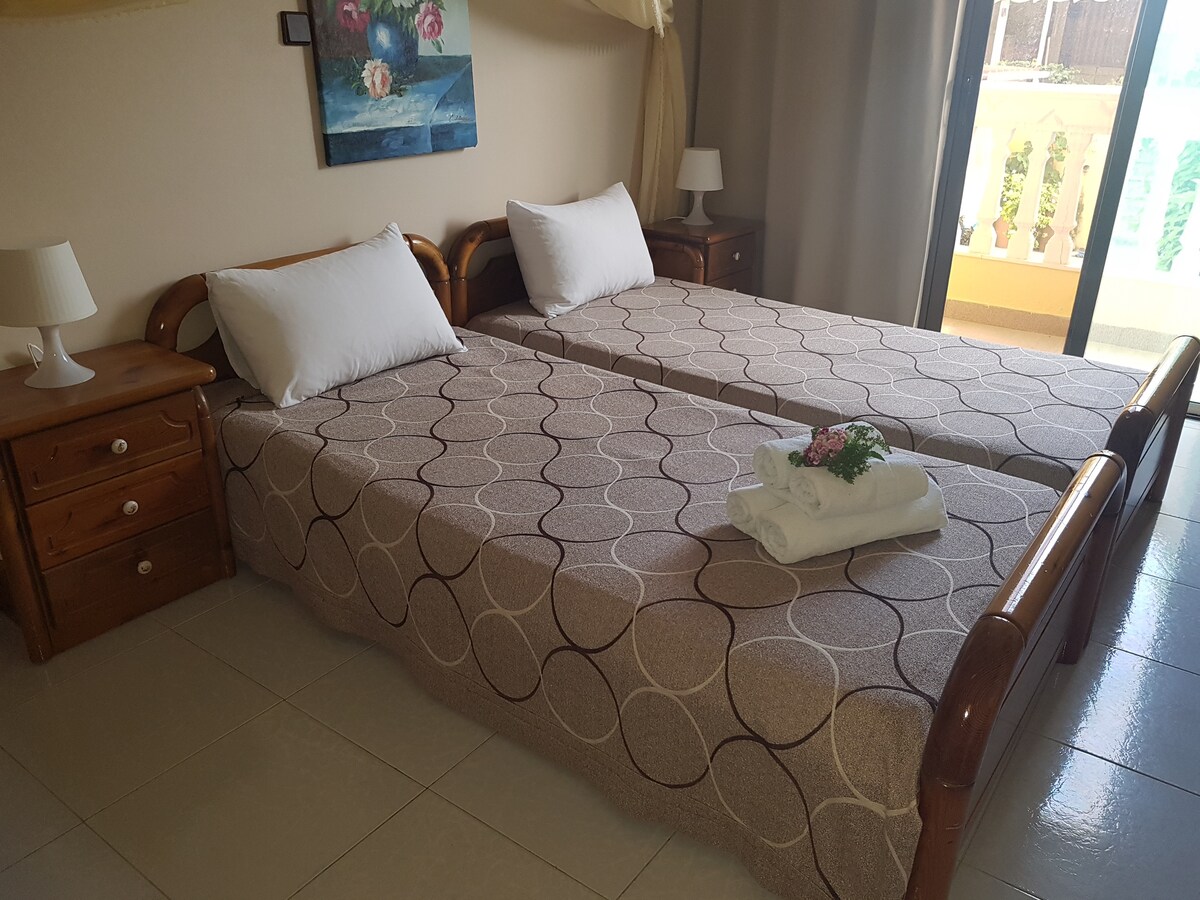 Šarmantna dvokrevetna soba s bračnim krevetom u srcu starog grada Rodosa Udobna dvokrevetna soba s 2 kreveta za jednu osobu u srcu starog grada Rodosa. Mirna lokacija, samo 200 metara od ulice Sokratous i 400 metara od srednjovjekovnog dvorca. U blizini prodavnica, restorana i glavnih znamenitosti. Ima klima-uređaj, Wi-Fi, balkon i TV ravnog ekrana. Usluge pranja veša i taksija su dostupne uz doplatu. Idealan smještaj da doživite šarm istorijskog Starog grada!