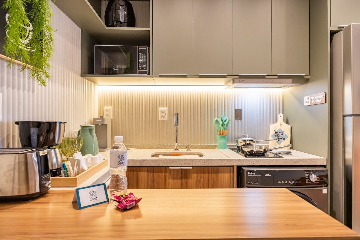 Novi studio u Moemi, najbolja lokacija, u blizini Shopping Ibirapuera (150m), metroa (500m), restorana, barova, pijaca. Park Ibirapuera udaljen je 2,5 km, a aerodrom Kongonhas udaljen 3 km. Moderan i udoban dekor, izuzetno svijetao, sa svom udobnošću! Bračni krevet (širine 150-179 cm), radni sto, internet 300 MB. Smart TV 55", kauč, kuhinja sa pločom za kuvanje, mikrotalasna rerna, dupleks frižider, kuhinjski pribor, nespresso, blender. Posteljina za krevet i kupatilo, nalazi se na 1. spratu. Vešeraj i teretana.