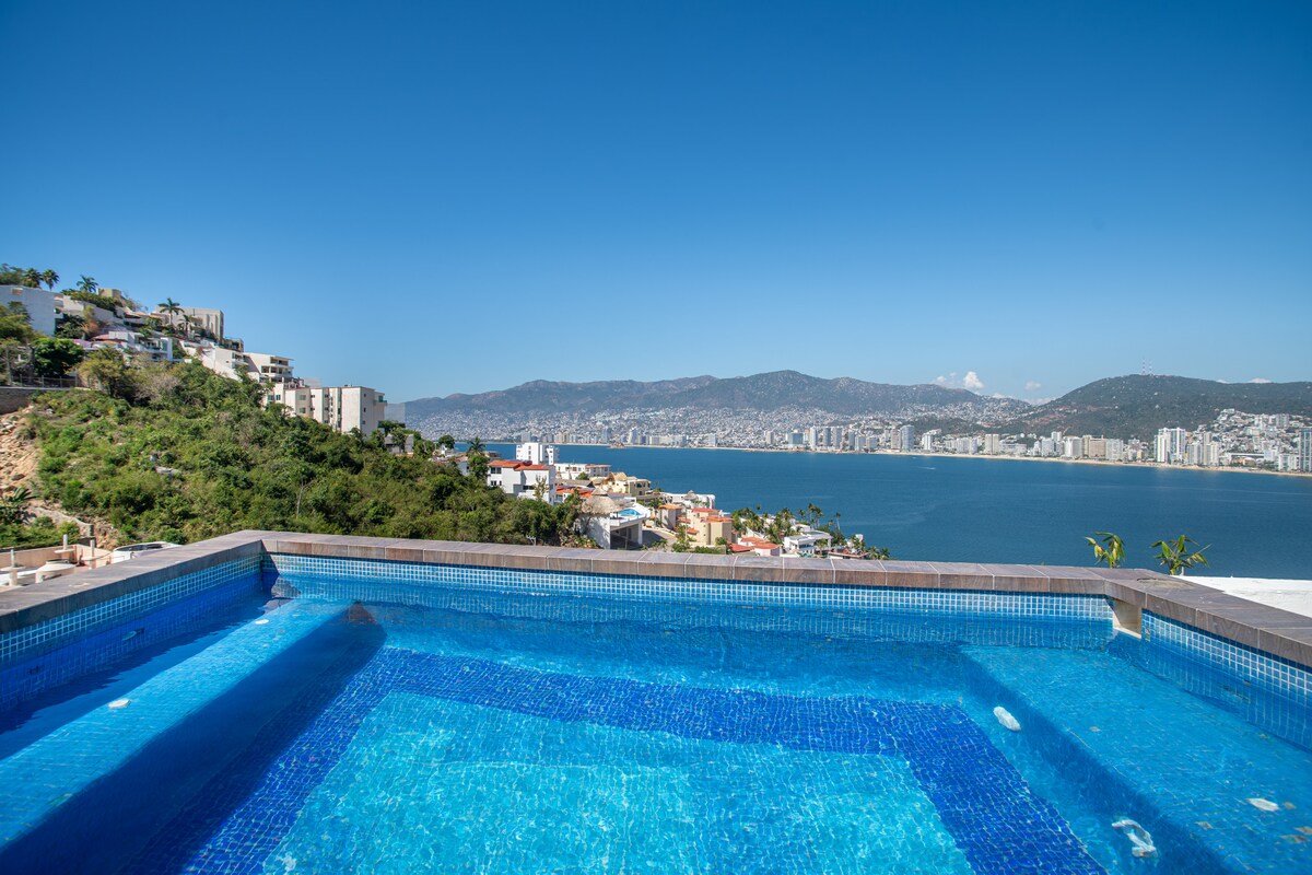Pent House pet Friendly unique in Acapulco with a 360 degrees view. Panoramski bazen koji vam omogućava da uživate u predstavi ronilaca u Kebradi. Potpuno otvoreni dnevni boravak i trpezarija sa prostranom terasom. Opremljena kuhinja i tri udobne spavaće sobe svaka sa svojim kupatilom. PH dekor je u mediterrane stilu. Prostor uživa u prirodnoj ventilaciji morskog povjetarca koji pruža dobar osjećaj postojanja.
