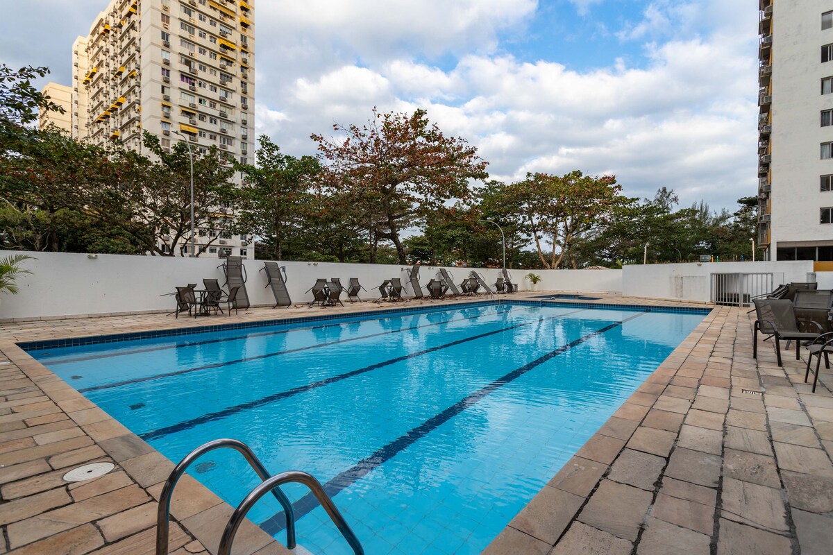 Izuzetno udoban stan za 2 osobe. Odličan pogled! Wi-Fi, restoran, parking, bazen, fitnes centar, sauna, recepcija, konsijerž i danonoćno obezbeđenje. Klima-uređaj i kablovska televizija, čajna kuhinja sa mikrotalasnom rernom, minibar, aparat za kafu i aparat za sendviče. Pored tržnog centra Map Band (sa Mac Donald 's, Cacau Show, American Stores, Banks, Laundry, Pharmacy, Boticário, Beauty Salon, Lottery, Rest. Braseiro...). U blizini su Projac, Rio Centro, Olimpijske arene i plaže Barra da Tijuca i Recreio.