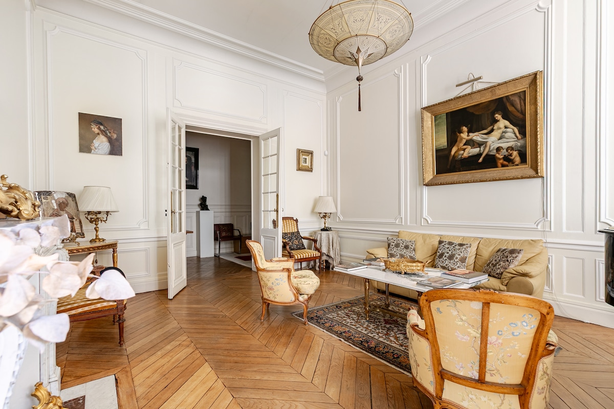 Entire PRIVATE 130 sqm apartment (7 rooms) – Exceptional Haussmann residence (4m ceilings), calm and filled with natural light, featuring a concert piano, artworks, 19th-century furnishings and garden views. Like a private home with high-end hotel amenities (Yves Delorme, Bernardaud, La Réserve, Jura). Prime location: 50m Porte Maillot, 50m Avenue Foch and 300mBois de Boulogne, 600 m Arc de Triomphe. Ideal for tourism, business, private events, shootings and Parisian lifestyle. Fully privatized.
