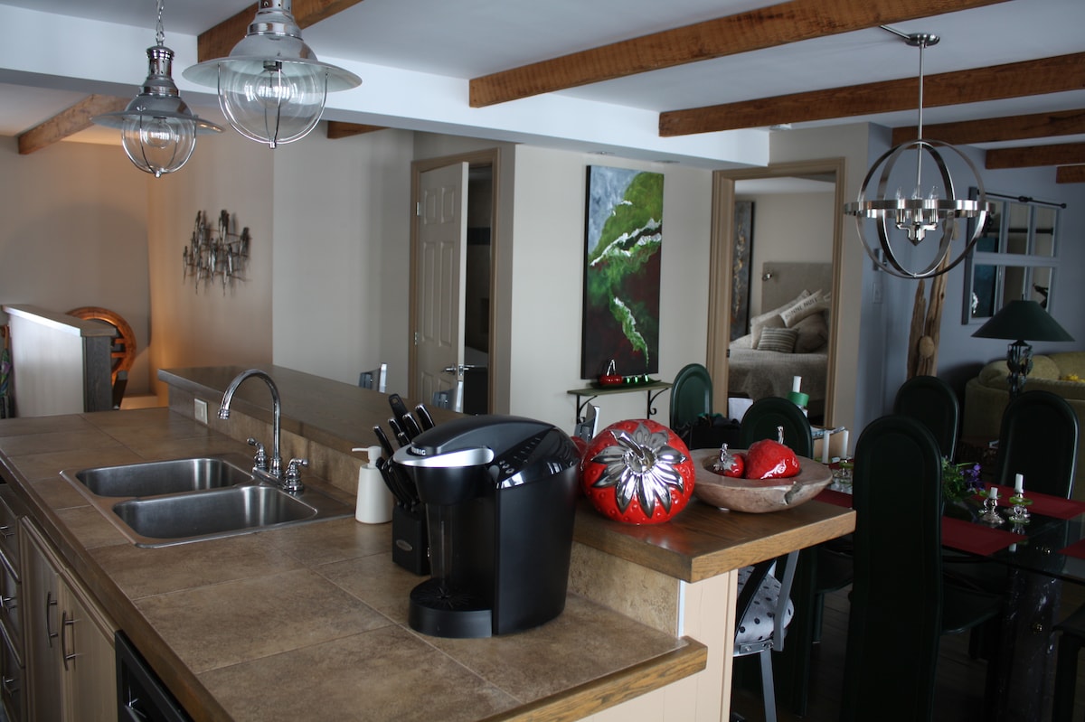 Le 98 est un appartement très éclairé et insonorisé sur 2 niveaux, idéal pour 4 mais peut accueillir 6 personnes. Situé sur la berge (60 pieds) et en retrait de la route principale, le fleuve coule dans notre jardin! Entièrement équipé et artistiquement décoré, cette résidence vous offre : qualité, confort et tranquillité, chambres douillettes, 2 salles de bain luxueuses, salon et salle à diner avant-gardistes et cuisine au goût du jour. WI-FI très performant inclus.