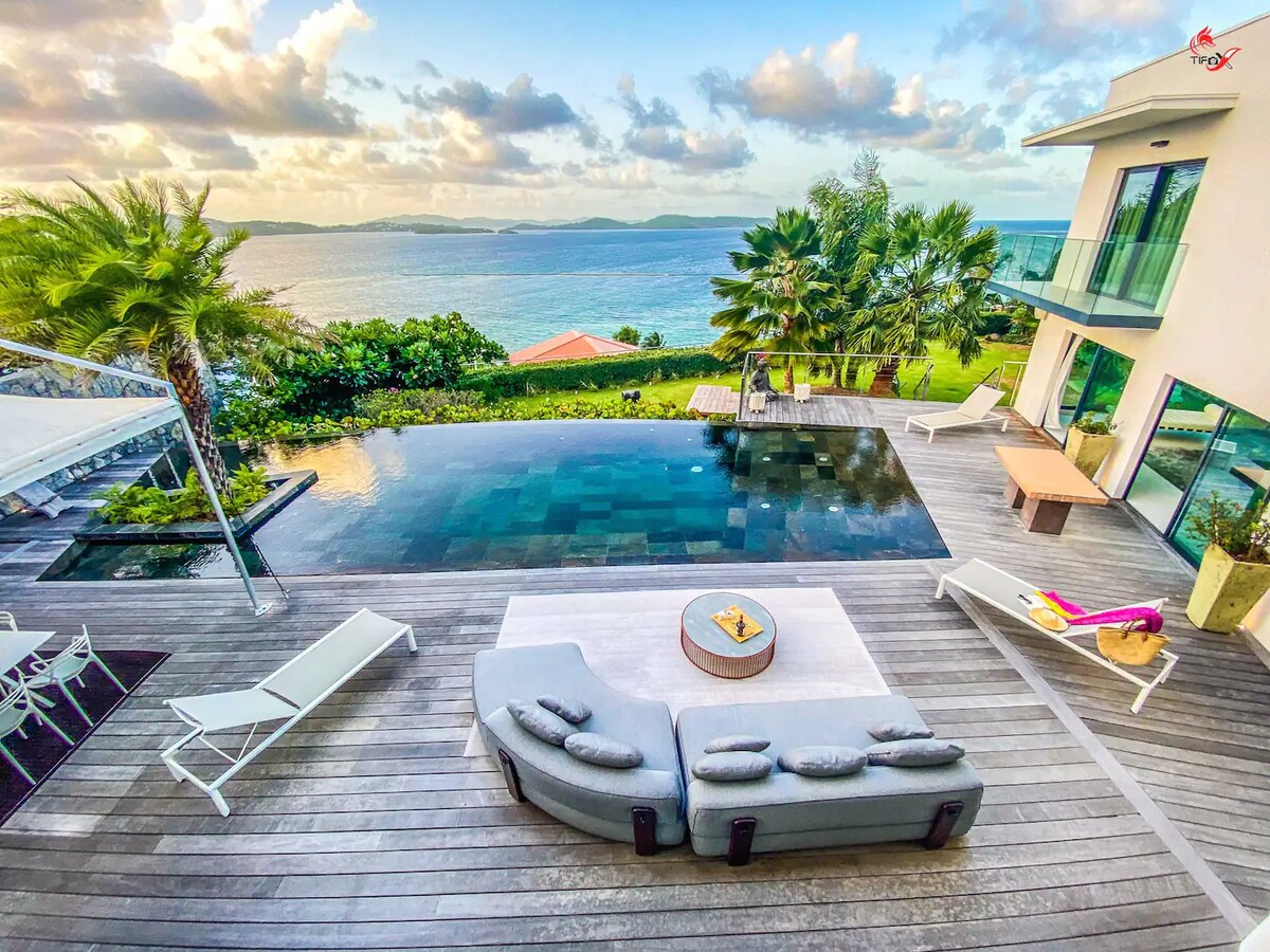 Vila Amara 3 je potpuno nova i vrlo prostrana luksuzna vila. Smješten na vrhu brda u Domaine d 'Amara, pogled od 180° na Karipsko more je nevjerovatan. Vila izgrađena 2025. godine je veoma velika (500 m2) sa ogromnom terasom od 200 m2 i beskonačnim bazenom dimenzija 11m x 4m odakle možete da vidite zalazak sunca iznad mora svake noći! Ukusno namještena, moderna i funkcionalna vila uključuje 4 velike spavaće sobe, svaka sa privatnim kupatilima.
