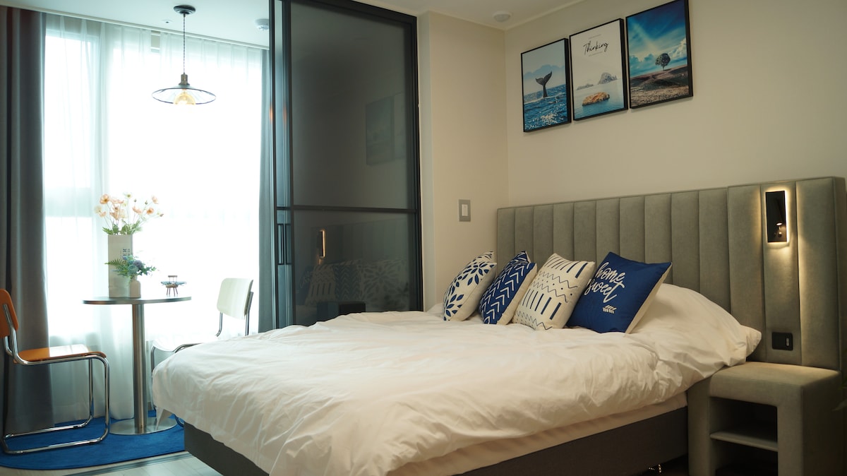il porto_ Incheon ⚓️⛵️ Bringing back host's experience as a former fashion designer in Italy, old port-themed wall deco Main colors _Ivory/Gray+Wood/Navy Mood_Neat, timeless 🕯️Custom Lighting *Dual LED bar *High-rise wall frame (7m-long multicolor LED) 🛌 *King bed 📺 4K Chromecast TV 🍿 FREE Netflix 💧FREE water purifier * E-Mart (2F., largest Daiso) 180m * Pets not allowed / Gym & Swim not in service/under Prep. * Korean/English bilingual host for direct support in case of emergencies