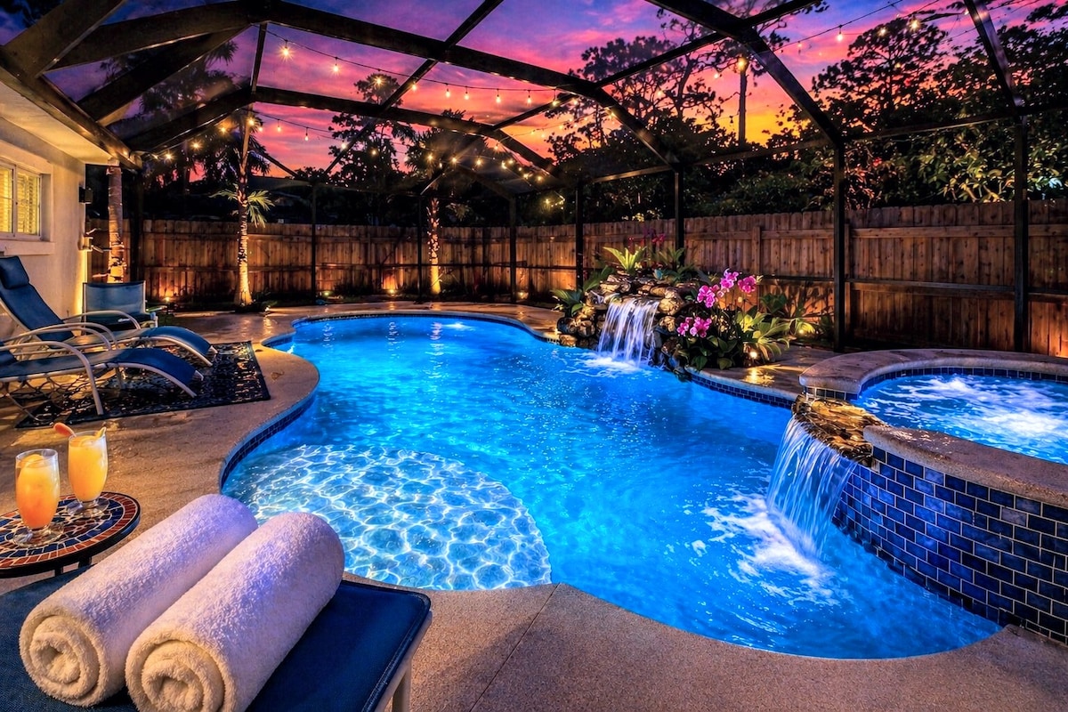 Uživajte u ovoj prelijepoj kući na plaži u blizini centra grada i rijeke Indijan i kratkih 10 minuta vožnje do okeana. Smještaj ima veliki privatni grijani bazen, spa centar* i tiki bar. Namješten sa dva bračna kreveta, krevetom na sprat sa duplim krevetom, bračnim krevetom sa jednim pomoćnim krevetom i kaučem na razvlačenje, ovaj odmor je savršen za jednu ili dvije porodice! Kuhinja je u potpunosti opremljena za zabavu za svaku priliku. Kompletno sa pametnim televizorima za povezivanje sa svim opcijama strimovanja...