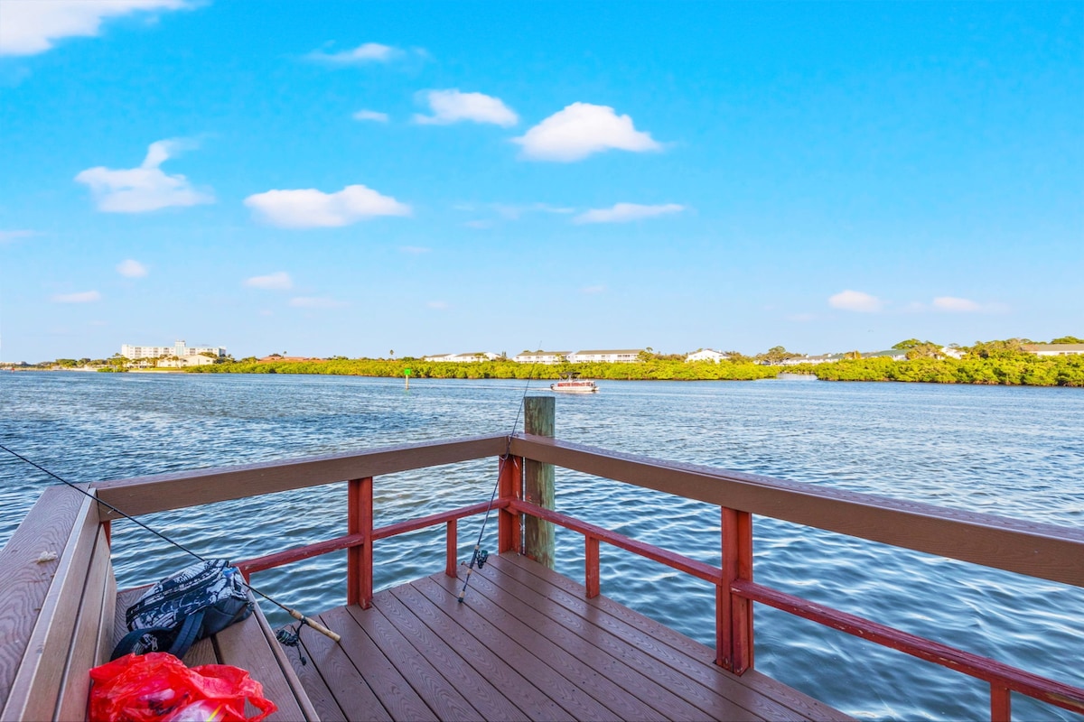 Beautifully updated spacious condo overlooking the intracoastal, just steps from the white sands of the Gulf and Indian Shores. Convenient to shops, bars & restaurants. Fully equipped kitchen, dining table with extensions. Oversized master bedroom with ensuite, king bed, walk-in closet, work desk & access to balcony. pool & fishing dock with direct access to intracoastal, great for kayaking!