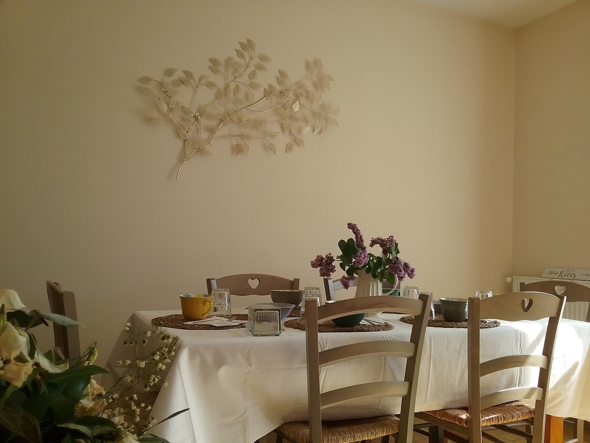 loue à la nuitée ou plusieurs jours le tarif est calcule en fonction du nombre de voyageurs ( possibilite de 4 personnes maximium ) chambres à l'étage dans une maison particulière avec salle de bain et toilettes à l'étage bureau disponible pour télé travail si besoin