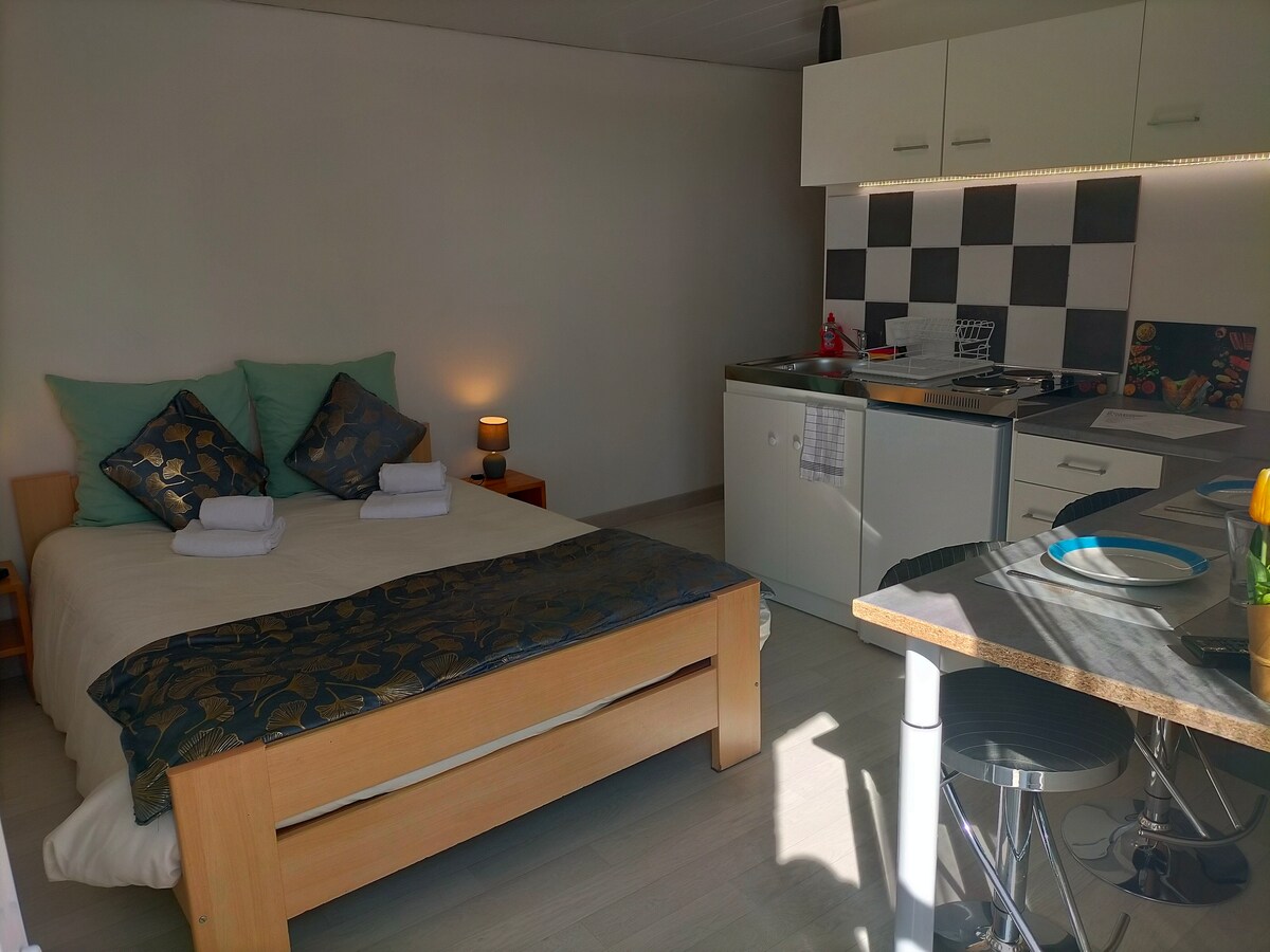 Studio je udaljen pet minuta hoda od centra Šaraka, sa barovima, restoranima i supermarketom. Prošetajte drugim putem i na jezeru, sa plažom i prostorima za piknik. Besplatan parking. Garsonjera ima privatni ulaz i nalazi se na jednom spratu. Obezbeđujemo bračni krevet, kauč na razvlačenje, kuhinju, trpezariju i zasebnu tuš-kabinu. Kuhinja je opremljena frižiderom, mikrotalasnom rernom, pločom za kuvanje sa dva kruga i čajnikom. Televizor ima francuske kanale, ali ima hdmi i USB portove.