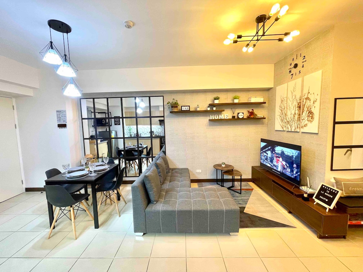 Relax with the whole family at this peaceful place to stay Bedroom Double size bed with Foam Mattress 4 large pillows 1 comforter + linen Smart Tv with Netflix Wifi Side table Aircondition Living/Dining Sofa 2-seater Dining table and chair Refrigerator Microwave oven Induction cooker Rice cooker Kettle Pot Mugs / plates / spoon&fork Trash Can 2-Mirror Bathroom Bidet Mirror Sink Water heater Shower telephone Trash Can One-time set up and freebie 2bottled water 1tissue roll SELF CHECK-IN
