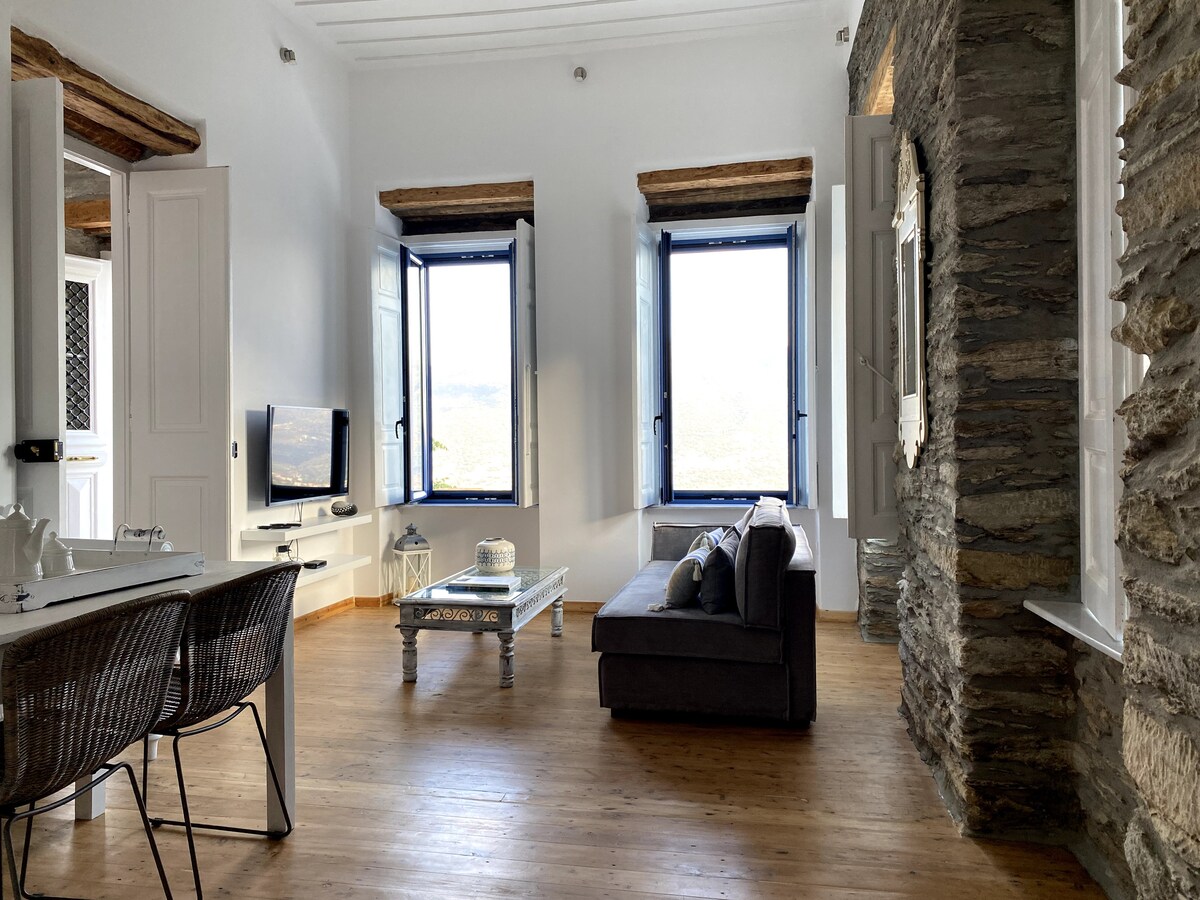 Apartman od 60 m2 za 5 osoba ispred mora na plaži Neibori, sa pogledom na Horu Andros i beskrajno plavetnilo. Nalazi se u istorijskoj kamenoj zgradi iz 1837. godine. Sastoji se od glavne spavaće sobe, druge zatvorene sobe koja se koristi kao dnevni boravak i pretvara se u spavaću sobu sa 2 kauča na razvlačenje i kuhinjskog prostora iznad kojeg se nalazi kupatilo, tu je i otvoreni izdignuti krevet, sa 2 pojedinačna dušeka. Nije pogodno za decu mlađu od 7 godina.