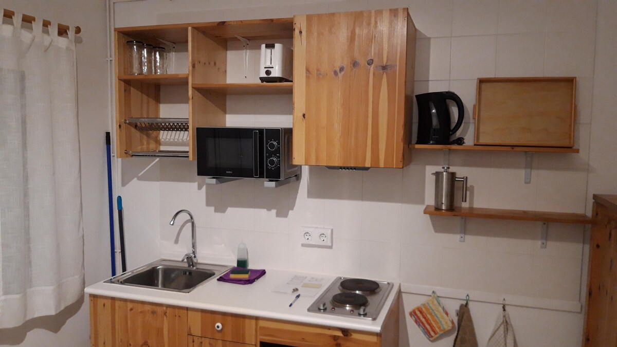 U stvari, 4 minuta hoda do plaže. Soba sa sopstvenim ulazom preko terase, soba od 17 kvadratnih metara, bračni krevet, TV, Wi-Fi, sopstveno kupatilo, (tuš i WC) i terasa od 8 kvadratnih metara. Kuća je na vrhu brda ako nemate automobil, moraćete da hodate uzbrdo da biste se vratili kući. Sada imamo kuhinju, šporet sa dvije ploče za kuvanje, ekstraktor, mikrotalasnu rernu i frižider od ranije i sudoperu, pogledajte fotografije... Tu je takođe ogledalo pune dužine. Nedavno dodavanje, tenda u terasi.