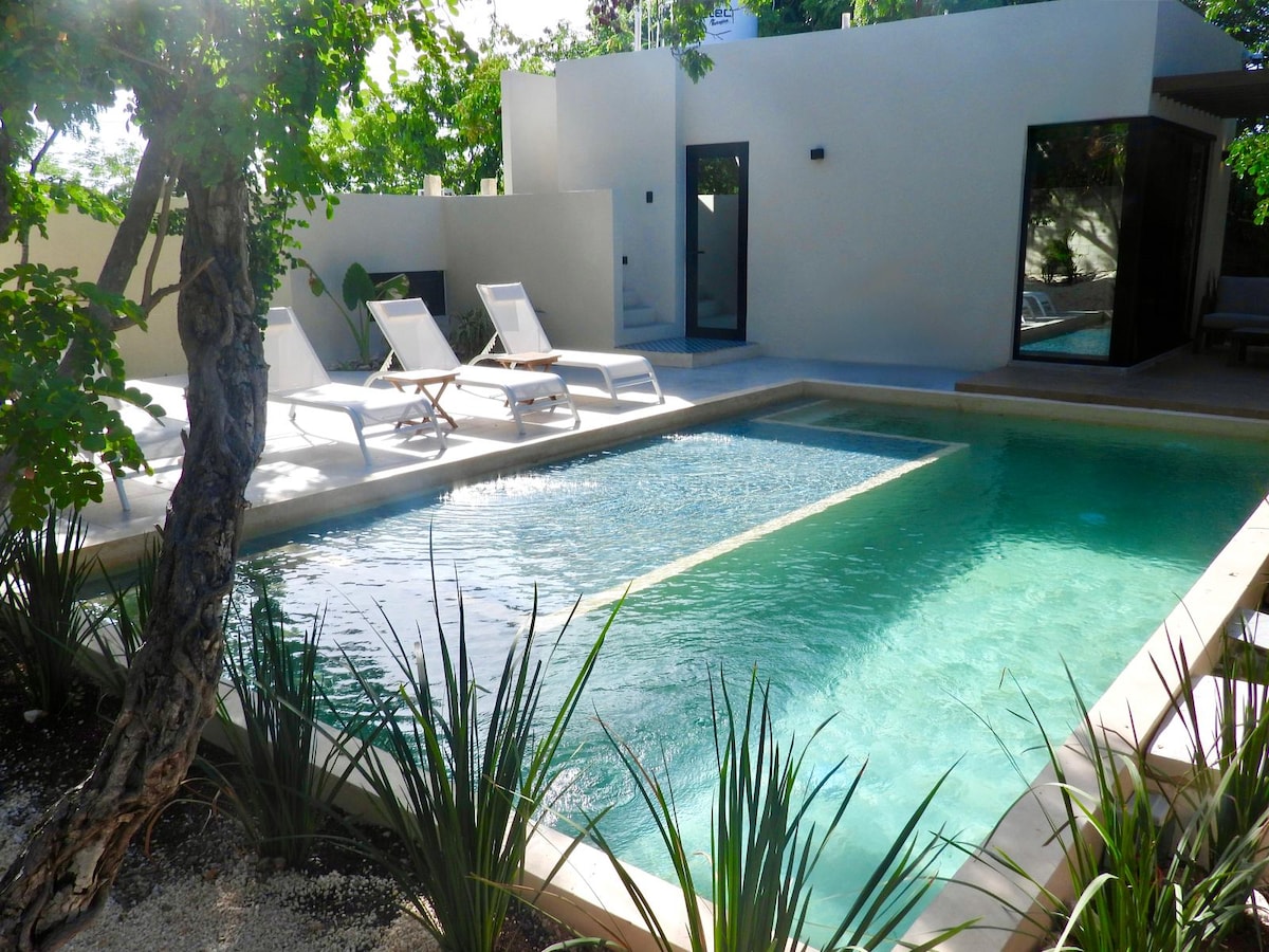 Beautiful luxury house with Mayan and hardwood style. A authentic Prehispanic experience. The suite has a equipped kitchen , bathroom, bedroom with smart TV ,and closet, private terrace and garden and a large shared pool chlorine free. Hermosa suite de lujo con acabados en maderas preciosas y estilo Maya. Una autentica experiencia mexicanca estilo prehispanico. Cuenta con cocina equipada,baño completo,recamara con Smart TV y closet,terraza y jardin privados y gran alberca sin cloro , compartida