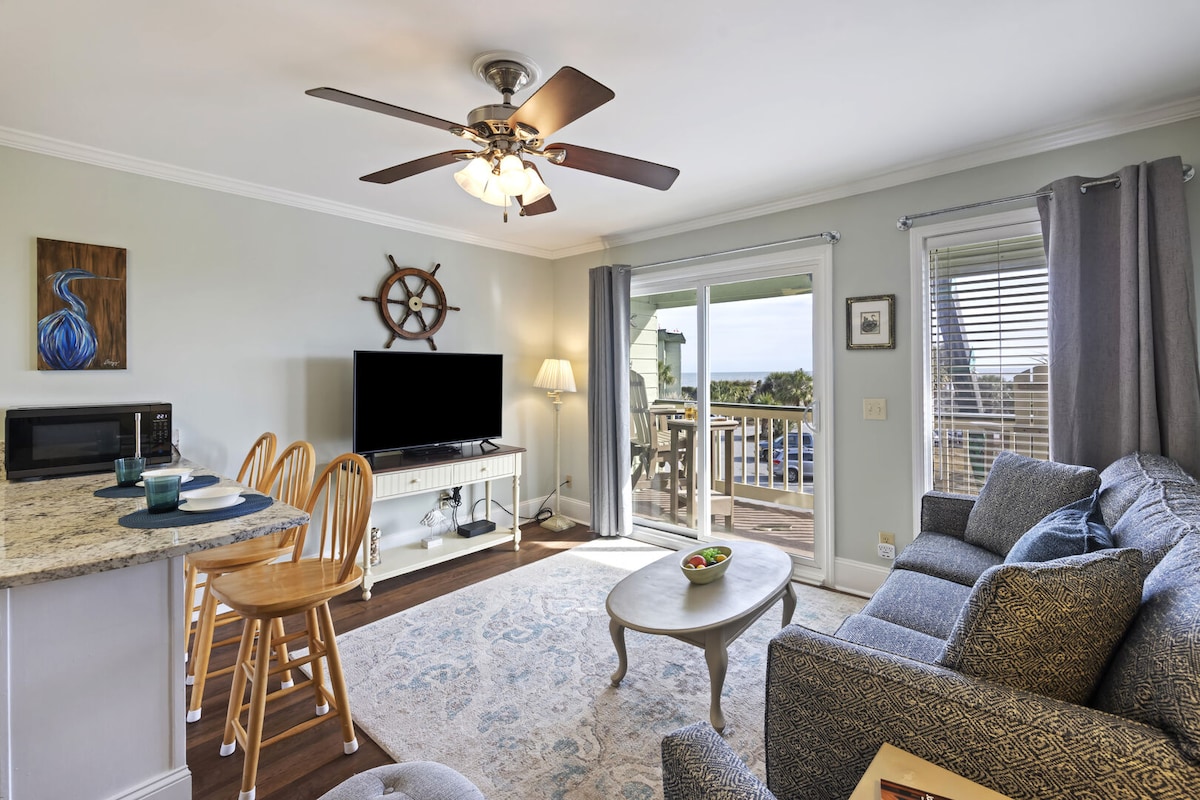 Make your next vacation unforgettable with a stay in our charming beachfront condo with privates beach access, a pool, and the only pier in town! Enjoy watching the sunrise from the balcony or take a stroll along the beach to feel the sand between your toes. After a long day of sunbathing, your fully equipped kitchen and comfortable living room provide the perfect setting for enjoying a family meal or game night. Don't feel like cooking? The shops and restaurants of IOP are steps away!