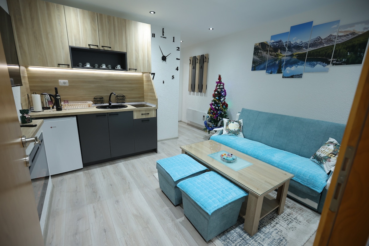 Ovaj komforno i luksuzno opremljen apartman ima prostranu dnevnu sobu, potpuno opremljenu otvorenu kuhinju, trpezarijski sto, kauč na razvlačenje, spavaću sobu sa fantastičnim krevetom, kupatilo sa tušem i WC-om. Naš apartman ima veoma prostranu privatnu terasu/balkon (19 m2) sa garniturom za sedenje i ležaljkama, odakle možete uživati u pogledu na planinu i Bjelašnicu koji oduzimaju dah, kako leti tako i zimi.